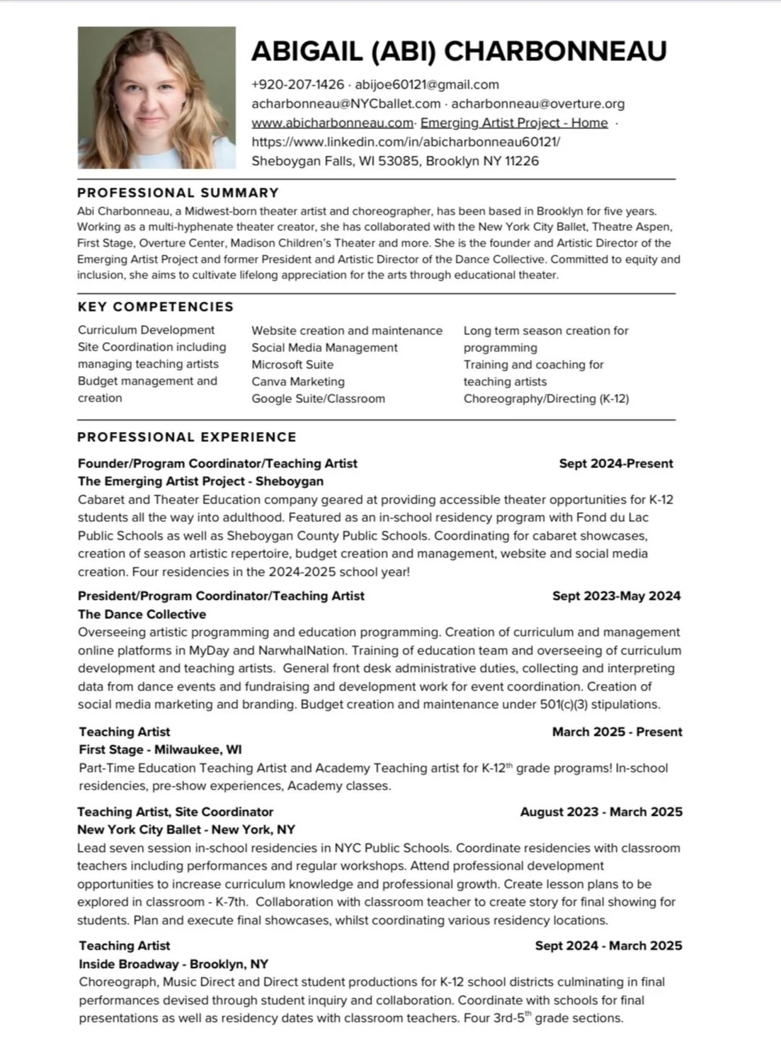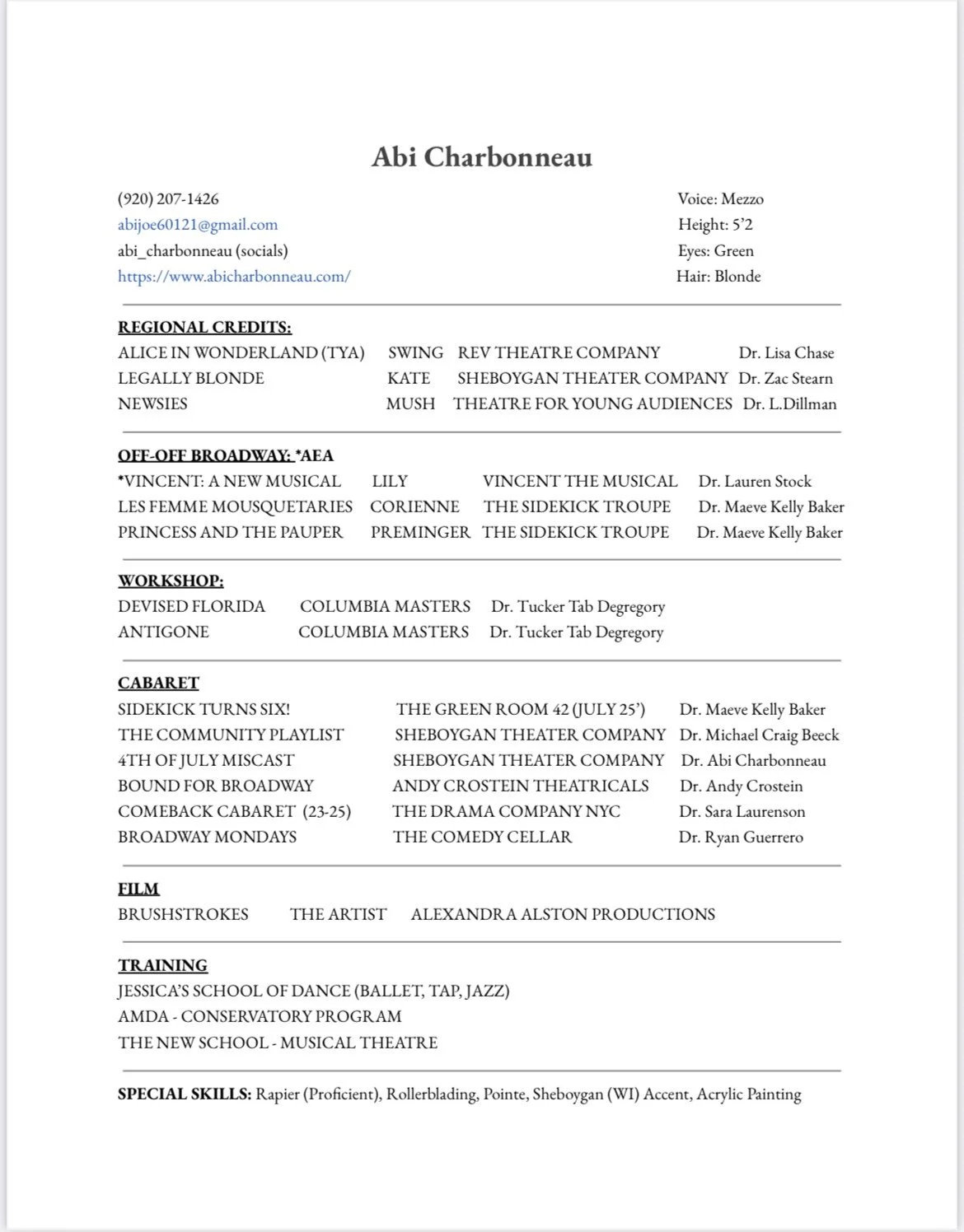 Resumes and Headshots and More, OH MY! Resume Downloads: Performance Resume Google Drive Link: https://docs.google.com/document/d/1B0-0B9YK0c4dYR474AhpET_j2syq7JR8dp5X03W8TNY/edit?usp=drivesdk Artistic Resume https://drive.google.com/file/d/13mFDYCrRsk-ulkxQ5FJaXdPGA2-xxAea/view?usp=drivesdk Headshot Google Drive Link: https://drive.google.com/file/d/1e_u1glXoHANNluWOyYOdzpNwzbX526VP/view?usp=drivesdk